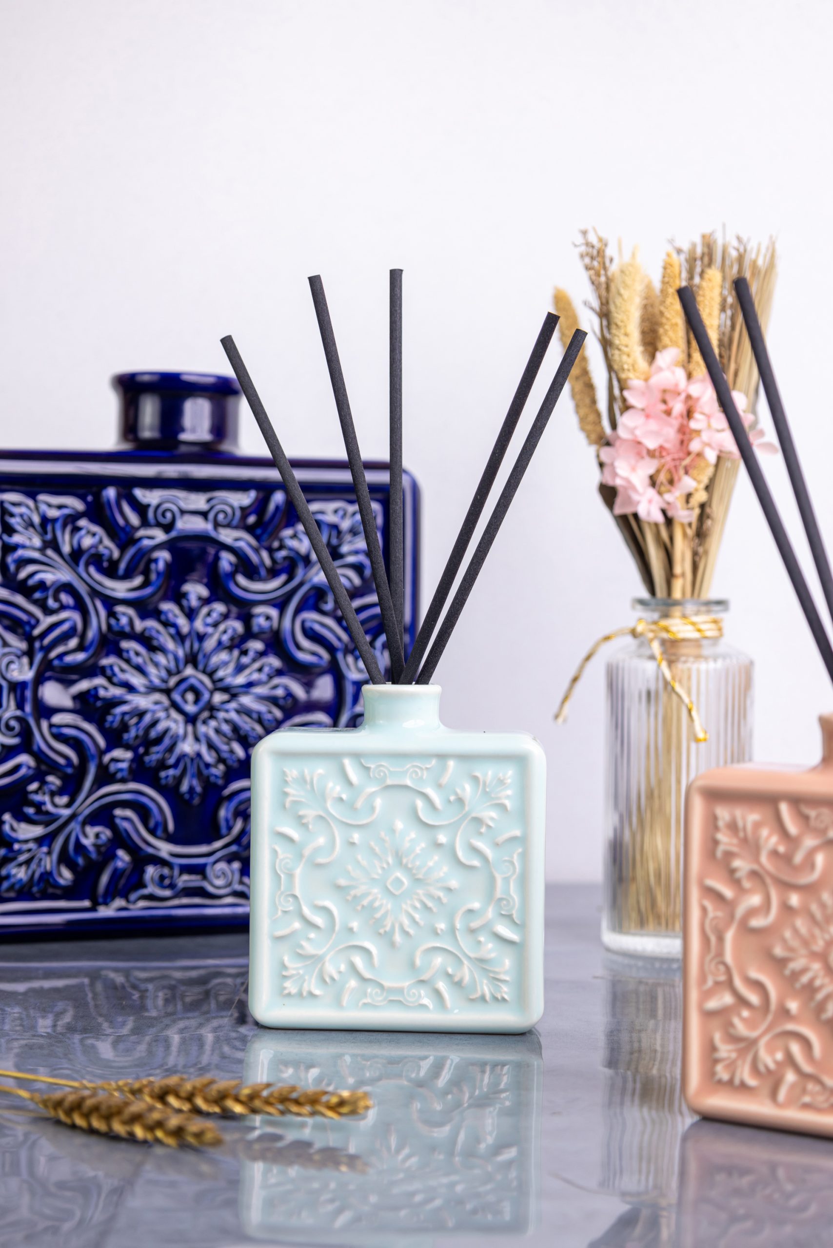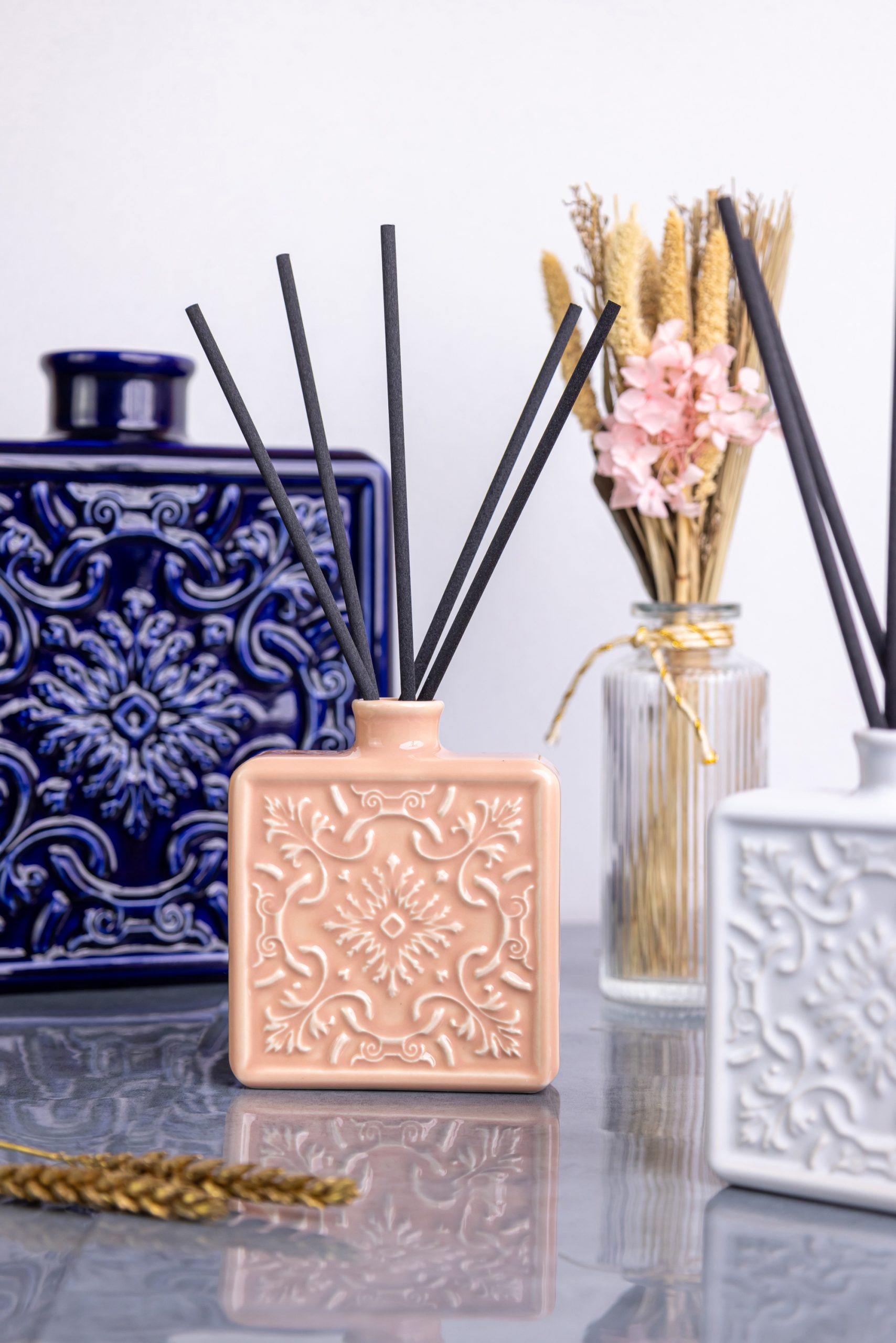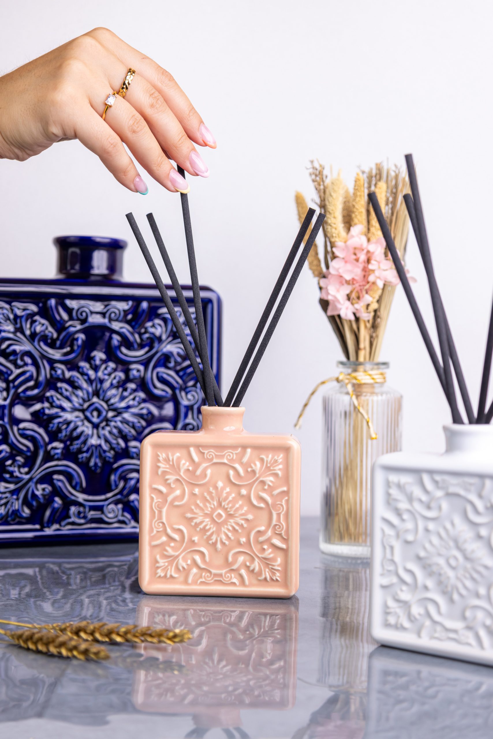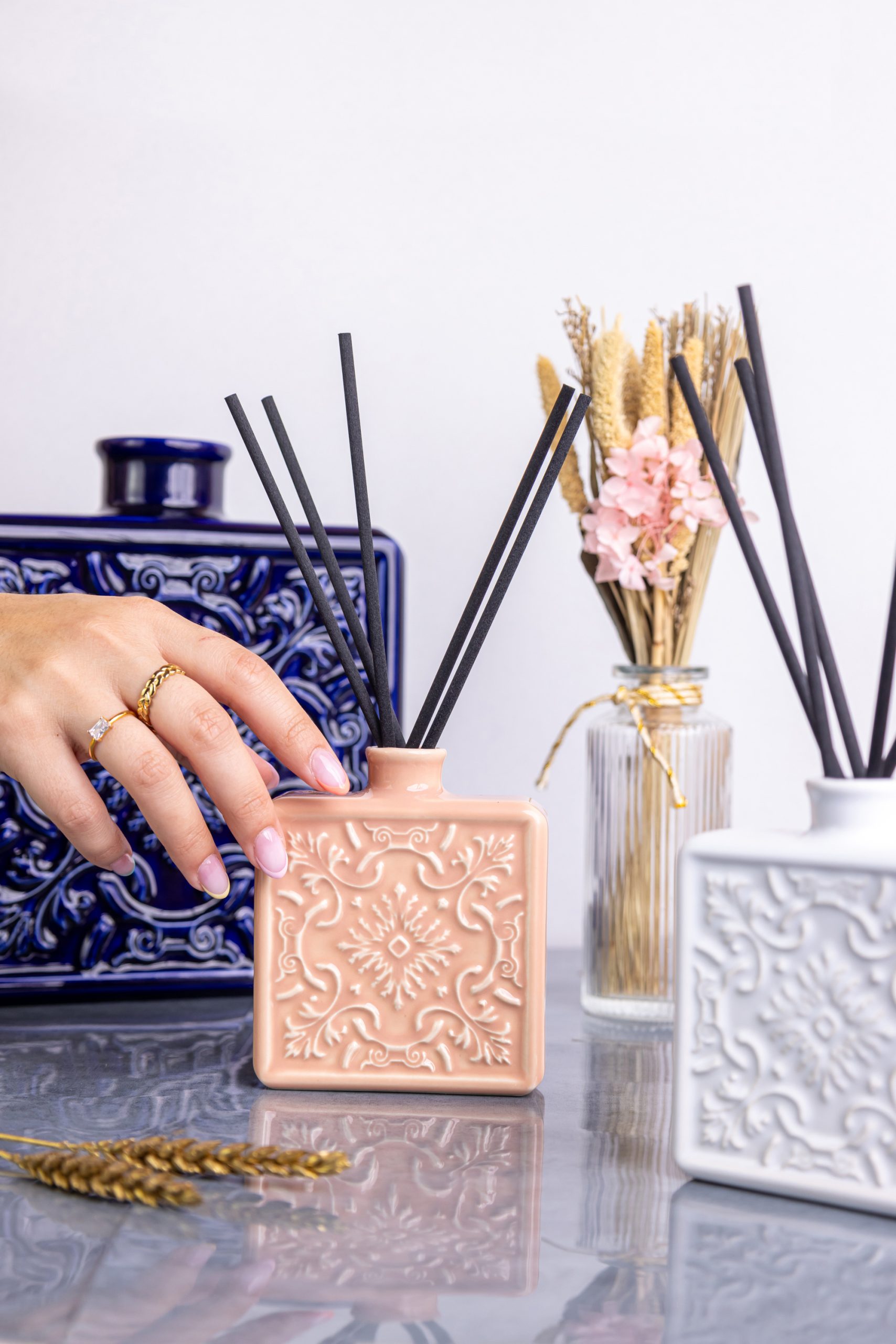 O resultado final mostra a essência e elegância dos produtos em imagens e vídeos onde cada detalhe foi cuidadosamente pensado para realçar a beleza e funcionalidade dos difusores.